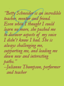 Once a year, the studio produces showcases in a performing venue with live musicians and back-up singers. Students support each other during rehearsal and performance in developing their art. The atmosphere is one of “going for it” and it is infectious, as each singer experiences the rewards of risk-taking and sharing deeply.